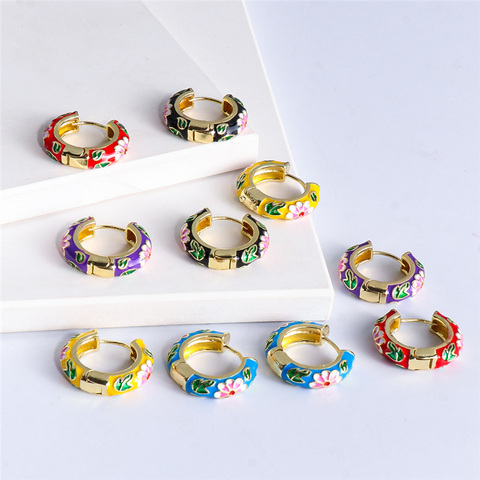 Huggie-pendientes coloridos esmaltados a la moda, aretes de aro con flor de esmalte chapados en oro Y2K personalizados